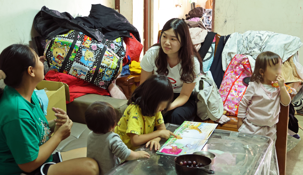 但換床只是開始。社工不僅帶來奶粉、尿布等生活補助,還坐下來和媽媽聊孩子的日常,從大姊的功課到二姊的早療評估,並陪伴媽媽學會觀察二姊的發展需求,鼓勵她聯繫醫院追蹤評估結果。社工還帶來好多繪本,四姊妹最喜歡圍坐成一圈聽她說故事。媽媽也漸漸會主動分享心裡的難處,例如孩子吵架時的無奈、生病時的焦急,社工總是靜靜地聽,握住她的手說:「你已經很努力了。」