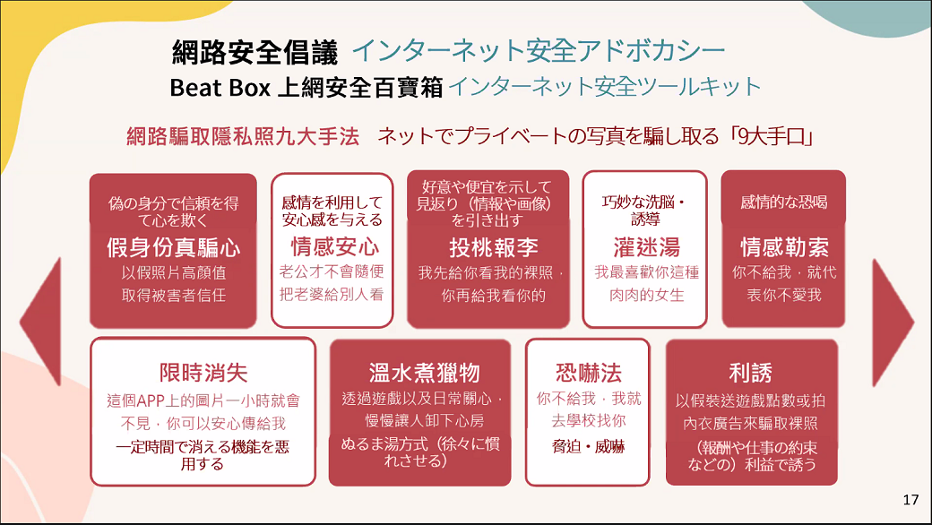 A. Internet use beginning at younger ages: Children in Taiwan now own their own smartphones at an average age of 10, and many create secondary or private accounts, often within a year, without their parents’ knowledge. These accounts allow them to interact more freely with strangers online.