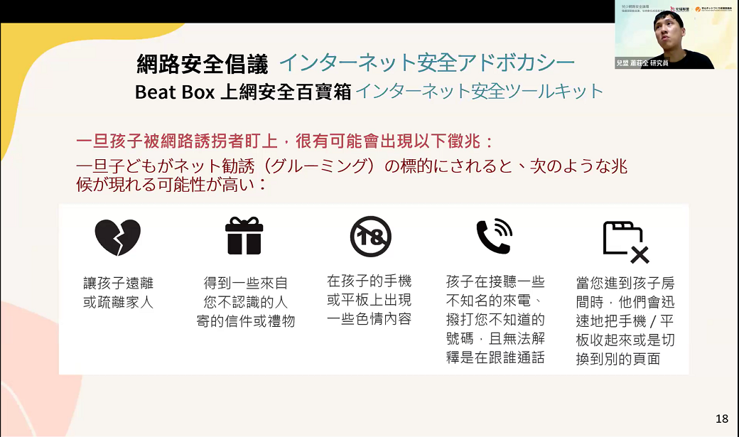 Chuang-Chuan Hsiao, a researcher with CWLF’s Research and Development Department, shared that CWLF’s attention to online safety issues began in 2000, when the organization identified its first case of a child running away from home due to online-related factors through the then Missing Children Information Center. According to a CWLF survey conducted that year, out of 19 voluntary runaway cases, six were linked to internet use. Since 2002, cases involving children leaving home due to friends they met online have continued to rise. In response to this concerning trend, CWLF launched systematic surveys on online safety in 2005. Today, CWLF’s work on online safety for children is carried out through three main pillars: systematic surveys, online safety–related services and tools, and policy advocacy.(I) Recent Online Safety Issues Affecting Children in Taiwan