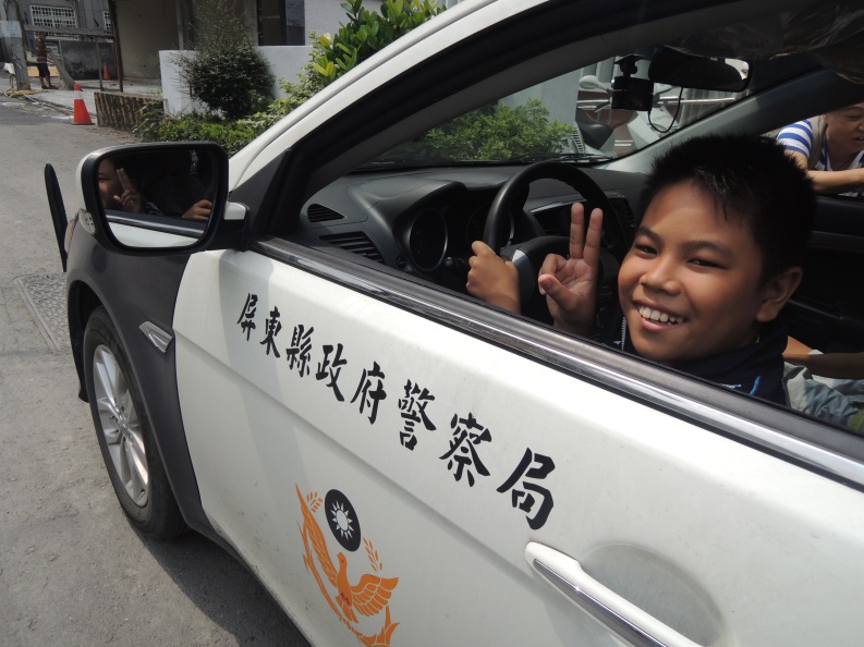 派出所所長警察開始介紹後,孩童們最感興趣的就是警用裝備的介紹,包含防彈背心、防彈衣、盾牌…等,。工欲善其事、必先利其器,當所長在介紹盾牌的功能是擋子彈時說,它可以保障警察的生命安全,進行攻堅和抵擋攻擊,是抓壞人的保護工具。有孩童好奇的問:『那遇到手榴彈怎麼辦?』所長回應說:『那就趕快逃吧!』引起大家哄堂大笑,而最讓孩童們印象深刻的是體驗穿防彈背心,拿著警棍,很有小小警察的架式呢!其中小星說:『盾牌其實一點也不重阿,你看,我拿得起來!』而第一次體驗坐上巡邏車駕駛座的阿勁說:『我以後也想當警察,因為讀警察大學,有零用錢而且之後還可以拿槍,很帥!』