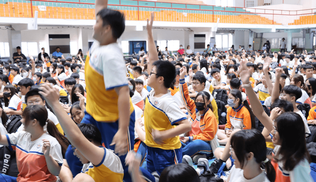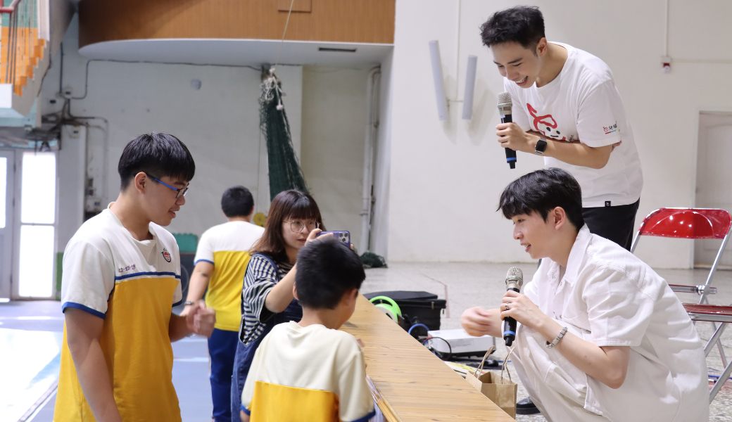 現場不論男生、女生,聽到浩文現身都忍不住歡呼尖叫,整個禮堂瞬間沸騰起來。更令人驚喜的是,同學們不只熱情聆聽,也非常踴躍舉手發問、分享自己的想法,讓現場對話充滿青春活力。