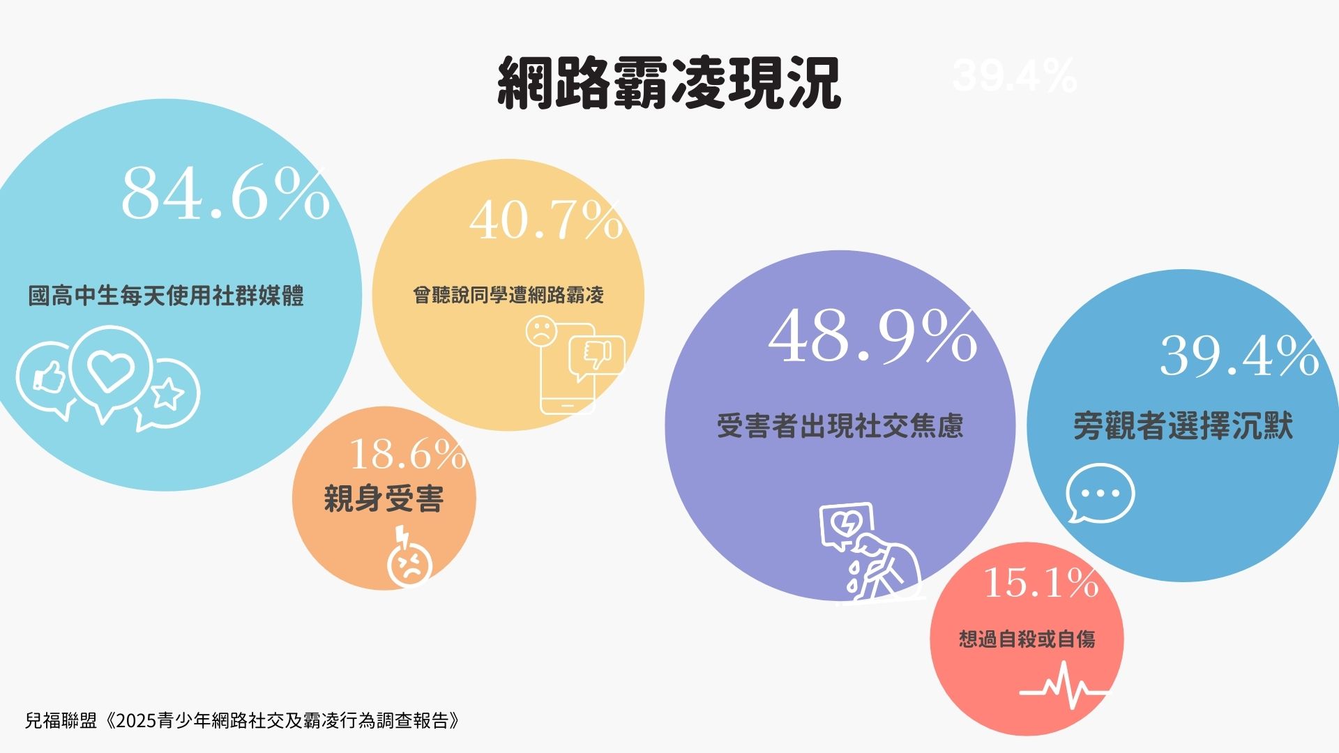 根據兒福聯盟最新調查,超過八成的國高中生每天都在使用社群媒體,近半數學生開設「小帳」隱藏真實自我,40.7%學生聽說過同學在網路上被霸凌,18.6%親身經歷過。更令人心疼的是,近半數受害者出現社交焦慮,15.1%甚至曾想過自傷或自殺。