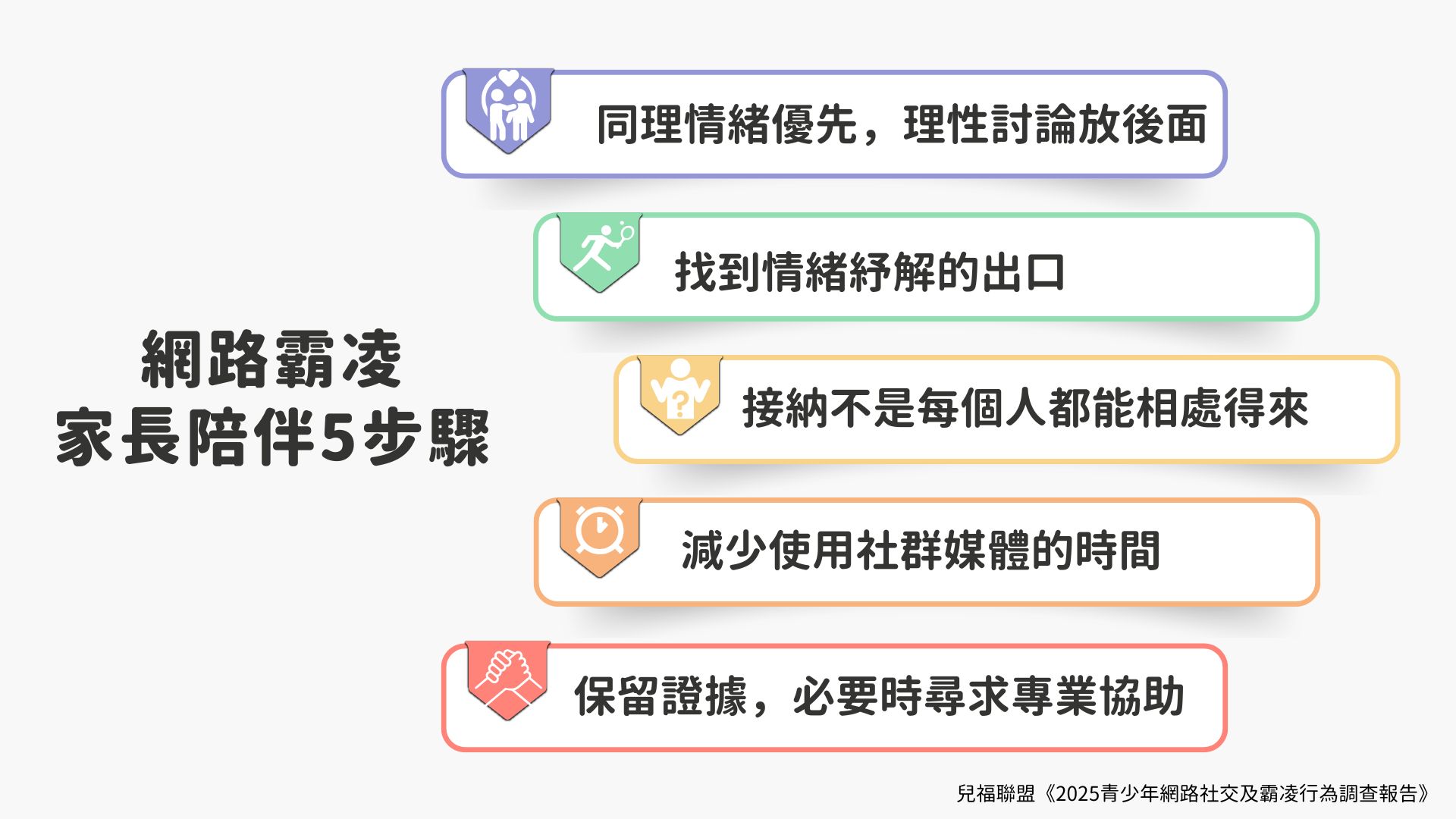 那什麼是「關心」?不是查看孩子的訊息紀錄,而是真正理解他們在網路上的互動狀況、情緒壓力,以及需要什麼樣的支持。調查也發現,情緒調節能力和人際資源較高的孩子,遭受霸凌的比例較低,受傷後的復原力也較強。