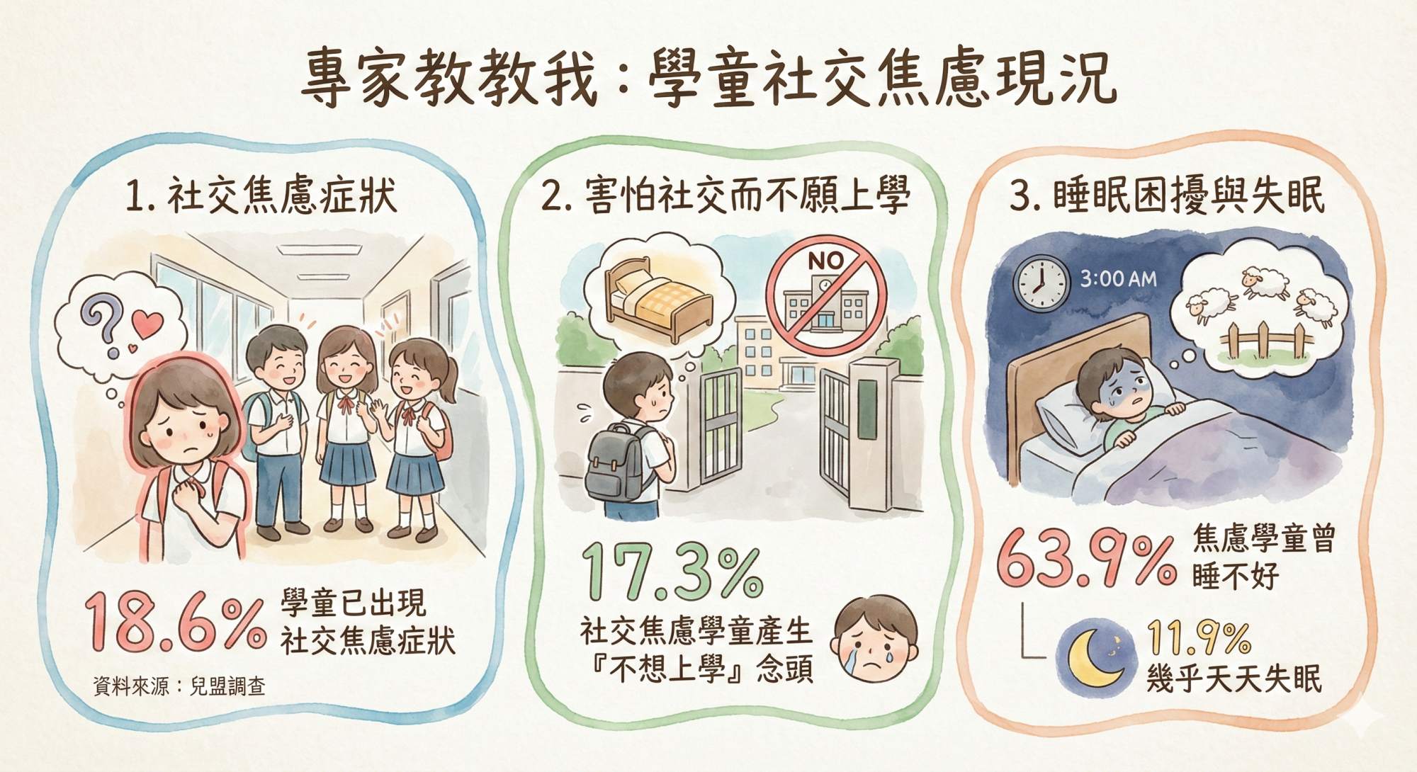 社交焦慮已影響孩子身心健康。調查發現,社交焦慮學童因為害怕社交而產生「不想上學」念頭的比例高達17.3%,是一般孩子(4.5%)的3.8倍。此外,超過六成(63.9%)的焦慮學童曾睡不好,甚至有11.9%幾乎天天失眠,是一般孩子的2.6倍!