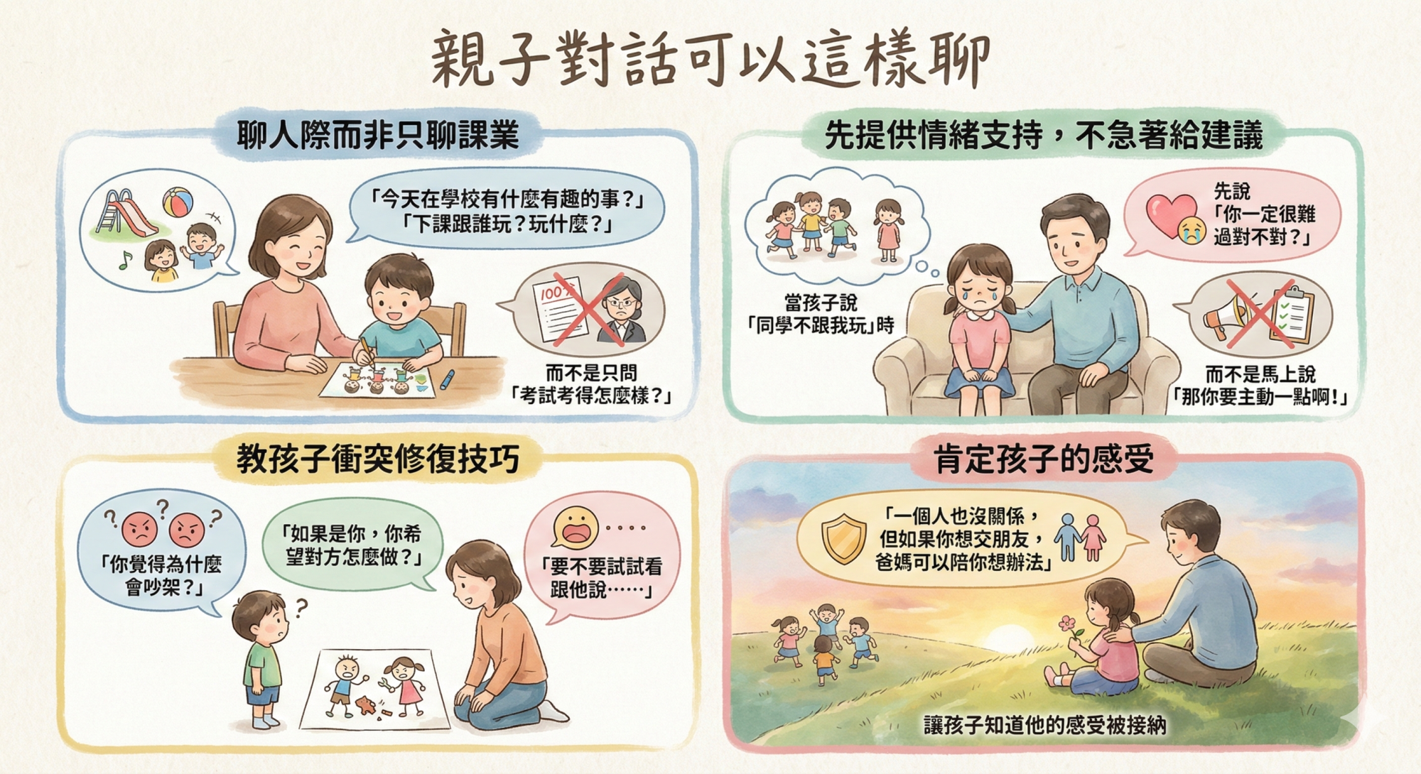 「你覺得為什麼會吵架?」「如果是你,你希望對方怎麼做?」「要不要試試看跟他說⋯⋯」