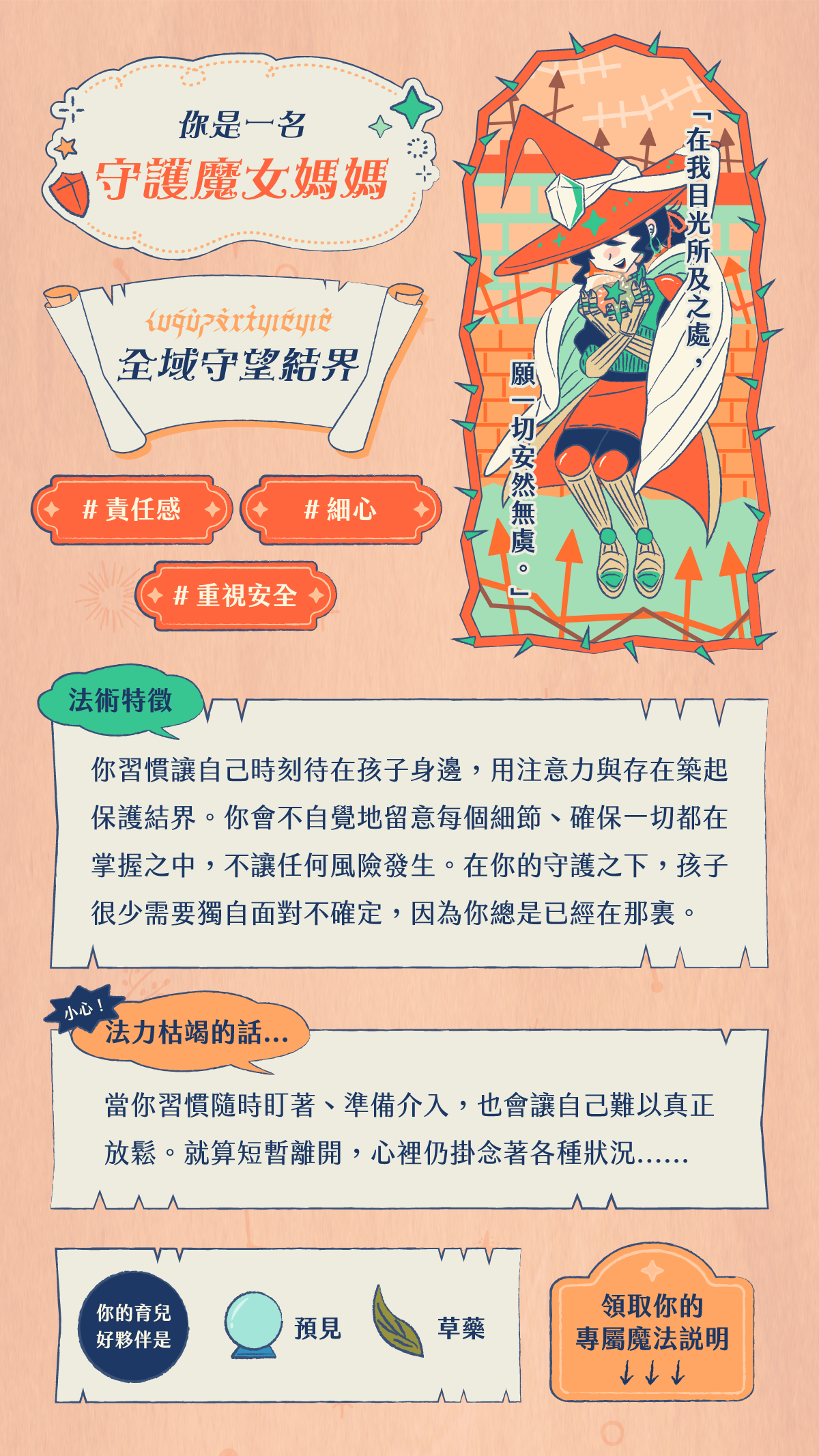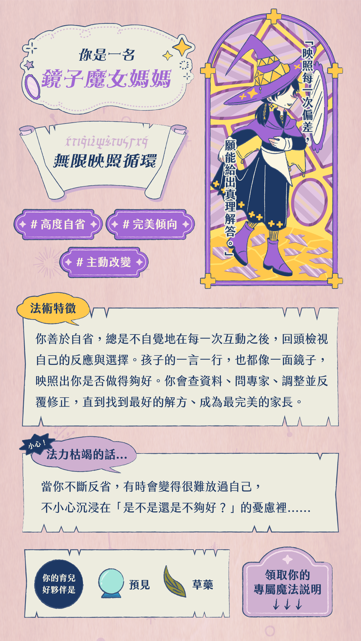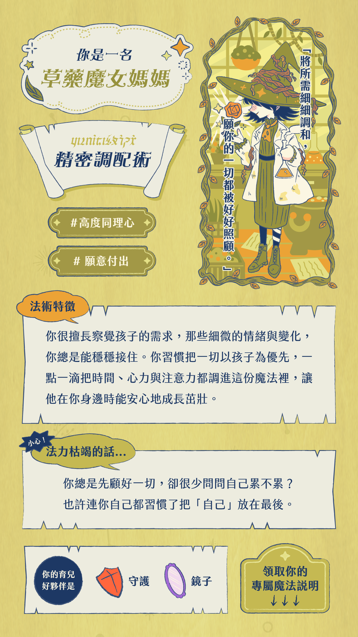 以下公開四種魔女媽媽的測驗結果,一起看看你的魔法藏著什麼樣的力量,也看看在你的法力快要枯竭時,可以有哪些資源陪你補充能量!
