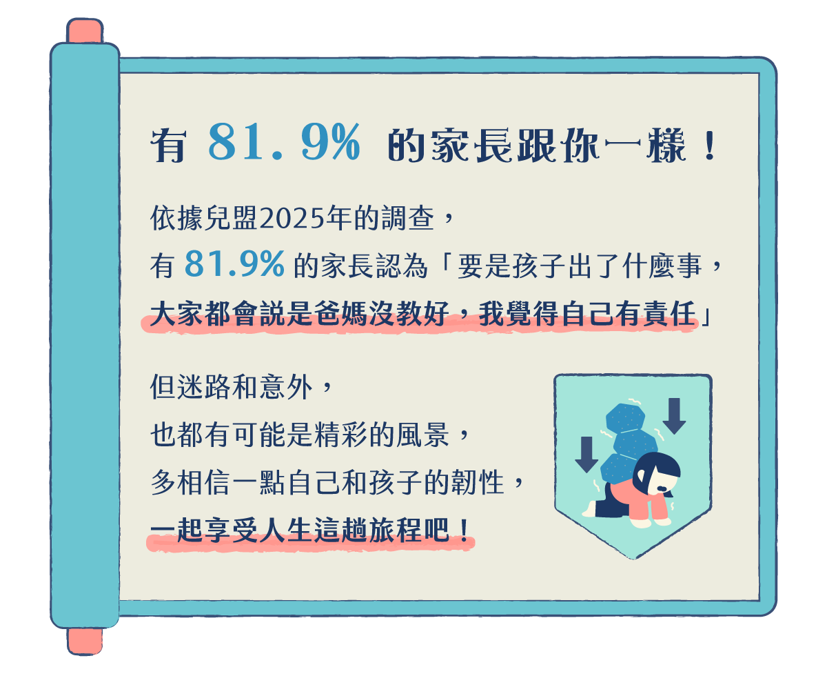 你很清楚:一言一行,都會影響到孩子。因此你很在意自己的每個決策、每次行動、甚至每個回應夠不夠好、正不正確?會不斷回頭檢視:「剛剛那樣是不是不夠好?」也會尋找專家學者、或是你努力想成為更好的大人,也因此,有時會對自己特別嚴格,很難放過自己。
