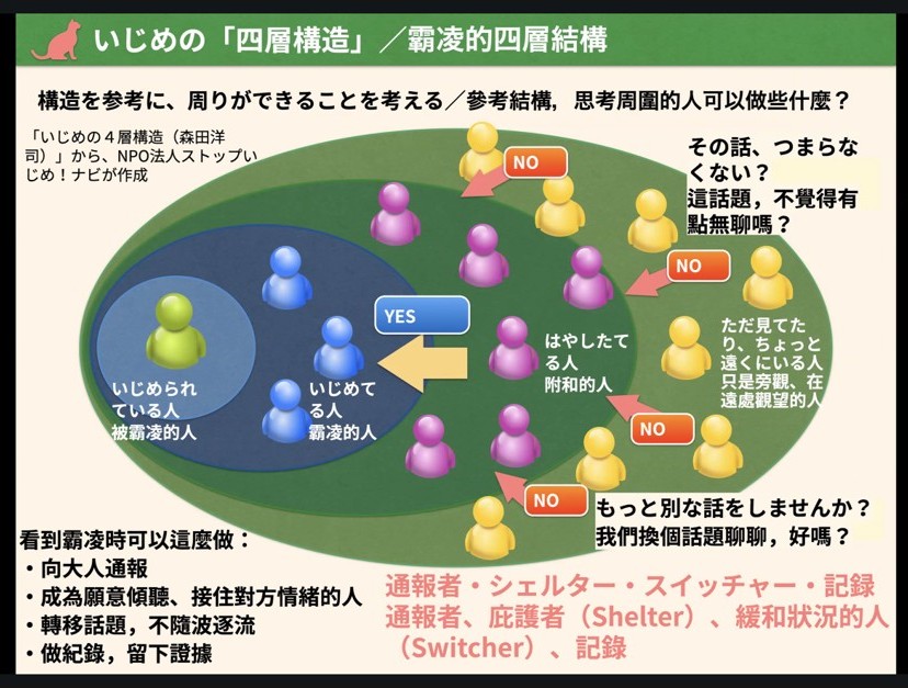 日本在校園霸凌討論中常使用學者森田洋司的「四層結構理論」,該理論區分加害者、受害者、附和者、旁觀者這四層人際關係 ,認為霸凌並非僅是加害者與受害者之間的雙人問題,而是深受周圍環境與人際關係影響的集體現象。%E6%97%A5%E6%9C%AC%E9%9C%B8%E5%87%8C%E9%98%B2%E5%88%B6%E8%AB%96%E5%A3%87/4%E5%9B%9B%E5%B1%A4%E7%B5%90%E6%A7%8B%E8%AB%96.jpg?1767168328356)
