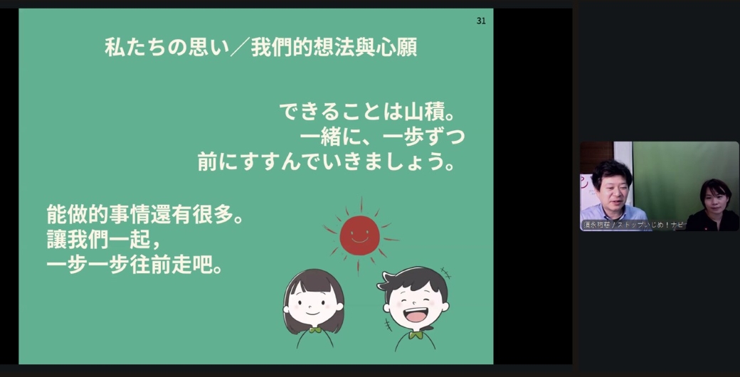 身為一個童年時期親身經歷過霸凌和拒學的人,須永副代表以個人及組織的身分積極推動各項霸凌防制工作,並鼓勵與會者們:「也許我們無法讓霸凌完全消失,但讓它變少的方法,其實還有很多、很多。」