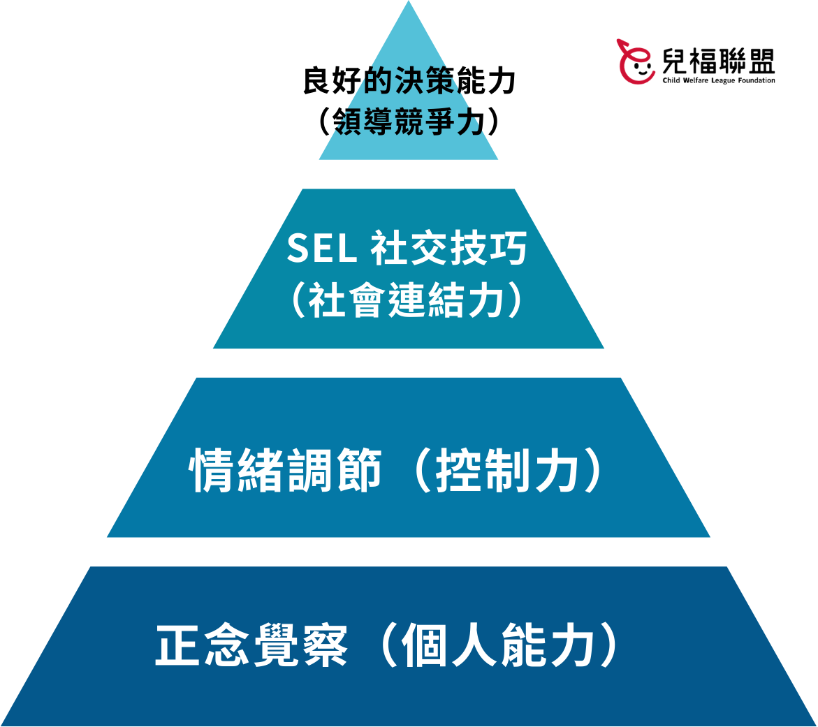 - SEL 社交技巧(社會連結力):在有自我管理(有效調節情緒、想法與行為)能力的前提下,才能有餘裕同理他人、理解規範,學習如何溝通,建立與維繫健康的關係。