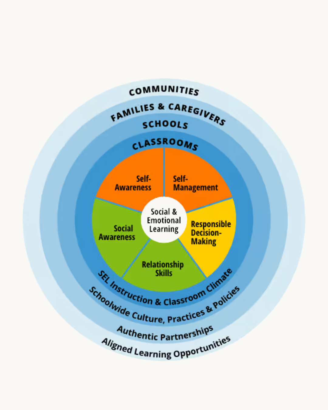 從這個模型的順序我們可以觀察到,SEL的能力培養,也是強調先從個人的能力開始(自我覺察、自我管理),再到團體與人際關係(社會覺知、人際技巧),最後再到更上層的決策能力。為了讓孩子的情緒教育扎下良好的根基,我們建議遵循「由內而外」的學習路徑: